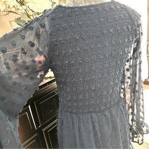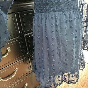 Elevate your wardrobe with this BTFBM navy smocked dress, designed with exquisite sheer Swiss dot sleeves and a chic V-neckline for versatile styling. The lined flowy skirt enhances comfort, making it ideal for various occasions.