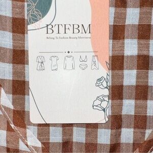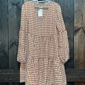 New with tags, never worn but has factory flaw. Small spots (pictured). Not sure what caused them or if they are washable or not. BTFBM brand. Size medium. Tan & white gingham plaid. Great for fall. Tiered skirt design. Ruffles. Boho style. Relaxed fit. Easy to dress up or down. Elastic sleeves. Looks great with booties. Long sleeves.