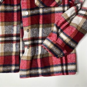 Red, white, black, and tan large plaid print Shacket. Soft, cozy flannel. Silver buttons, button pockets, long sleeves