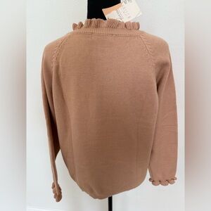 Cozy and chic BTFBM knit pullover sweater in a soft neutral beige/tan shade. Features charming ruffle trim details along the neckline, sleeve cuffs, and button placket for a feminine touch. Button-front accent with tortoise-style buttons adds style and versatility. Relaxed fit with ribbed hemline.