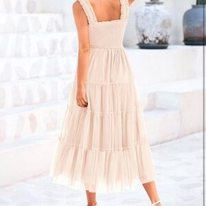 BTFBM Women’s Elegant Summer Midi Dress M Beige Smocked Tulle Ruffle NWT