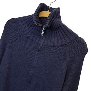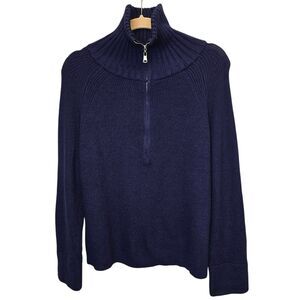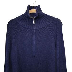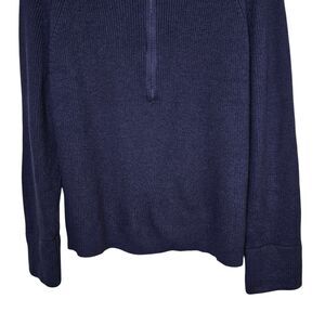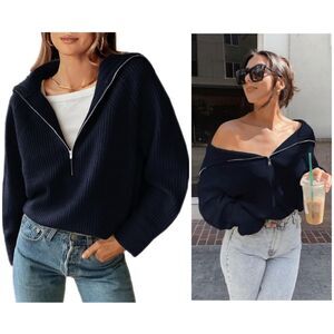 BTFBM Women's S Navy Blue Ribbed Slouchy Half-Zip Pullover Long Sleeve Sweater. Stylish navy half-zip sweater with a ribbed collar. Perfect for layering. 50% viscose, 28% nylon, 22% polyester.