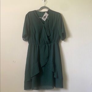 Step into elegance with this stunning green sundress, perfect for a wedding guest or a night out. Featuring a chic asymmetrical high-low hem and a flattering wrap design, this dress is adorned with delicate ruffles that add a touch of romance. The V-neckline and short sleeves enhance its sophisticated appeal, while the lightweight fabric ensures graceful movement.