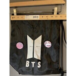Condition: Good pre-owned condition. The front BTS logo shows noticeable wear with some cracking and peeling of the print as shown in the photos. No holes or tears in the fabric. Drawstrings are intact and functional.