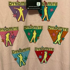 Pink t-shirt featuring a colorful Dynamite graphic design. Perfect for casual wear.