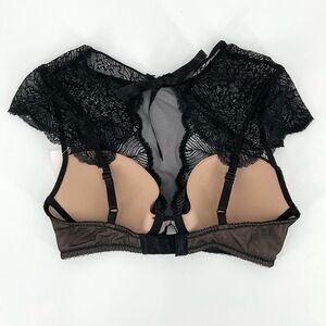 Designed to be on show with delicate lace and dramatic fishnet adorning the front and back. It features underwired foam cups and black satin bows to decorate. Soft lightly padded foam cups for great shape. Open back satin ribbon ties.. Hook and eye back fastening.