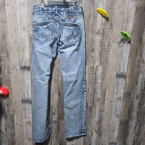 Details: straight leg, little stretch, factory acid wash look, zipper fly