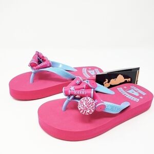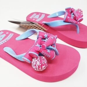 Bubbleflop flip flop sandal. Hot pink and blue with cheerleading details, pom pom and megaphone. Super cute for the little cheerleader in your life!