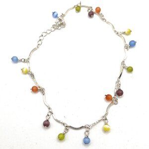 Silver plated faux cat's eye beads, it is 9 inches long with a 1 1/2 inch extender with spring closure. In excellent condition.