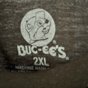 This is a black 2XL short sleeve t-shirt featuring everyone's beloved fuel and snack stop mascot, BUC-EE! The front features BUC-EE dressed in a skeleton costume with a spooky treat and bats behind him. The back of the t-shirt features a green truck with BUC-EE, a haunted house, as well as the saying "Can't Talk Right Now...Doing Spooky Stuff."