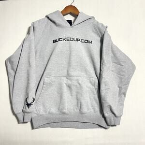This BUCKED UP hoodie is a classic pullover sweatshirt featuring the brand's logo prominently on the front and a deer skull logo on the left sleeve. It's a comfortable, relaxed-fit hoodie with an attached hood and a front kangaroo pocket. The material is a soft, medium-weight blend, likely a cotton/polyester mix, making it a great choice for loungewear or outerwear on a chilly day. The size is XXL, and the approximate measurements are provided in the images to ensure a perfect fit.