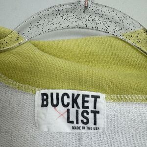 Stylish cropped polo shirt in olive and white by Bucketlist. Features a classic collar and buttoned neckline. Short sleeves. Colorblocking. Material almost feels like a light sweatshirt terry. Small pocket on chest. Good preowned condition with very light wash wear. Brand tag has an X on it so no store returns and fabric tag is very faint. Women’s size large.