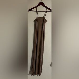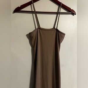 Step out in style with this elegant taupe/Brown ribbed Midi dress. Perfect for any occasion, this dress offers a sleek and sophisticated look. Dress it up or dress it down.