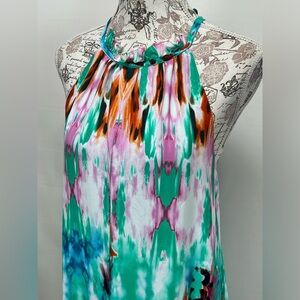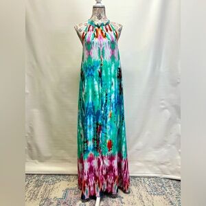 Aqua, fuchsia and green tie dye halter neck maxi dress from BUDDY LOVE, size M. Dress is fully lined and has zip back and button neck closure.