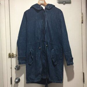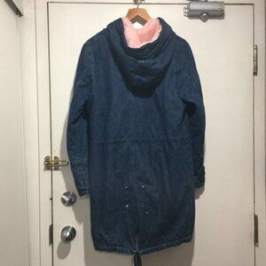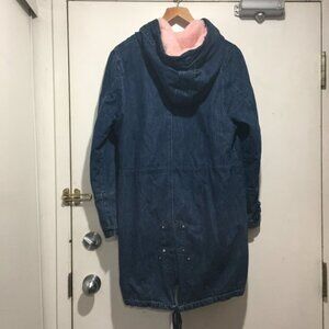Buffalo Long Denim Jacket, Size L, Color Blue Wash, 100% Cotton, Removable Pink Sherpa Lining, Side Pockets, Waist, and Bottom Drawstring Closure Zipper, Snap Buttons, Good Condition, It is a Beautiful Parka Jacket, Great Look, Great Fitting.