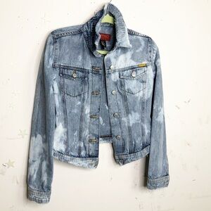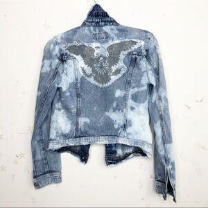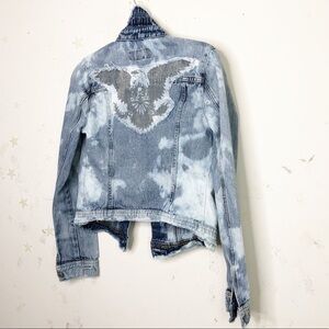 Buffalo David Bitton distressed Roy detailing bleach splash denim jacket, with eagle stitched on the back 100% cotton.