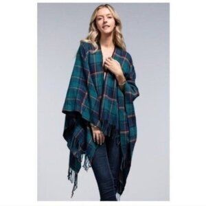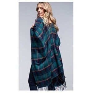 STUNNING SOFT PLAID RUANA WITH FRINGE ACCENT.