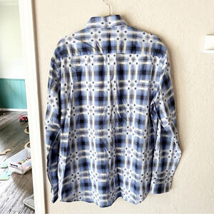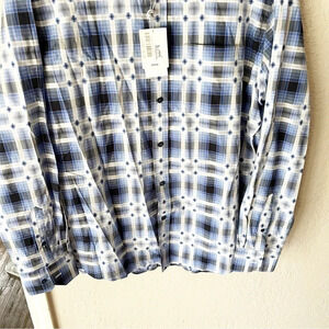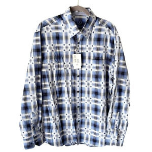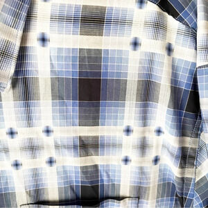 DETAILS: Bugatchi size XL. Geometric print in blue and white. Button down. Cotton, dry clean or hand wash.