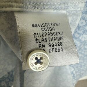 Keywords: Bugatchi, floral shirt, men's button-up, short sleeve, summer fashion, casual wear, blue shirt, breathable fabric, lightweight, 8-way stretch, classic fit, pre-owned, men's fashion, cotton blend, summer wardrobe.