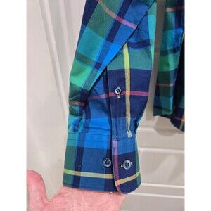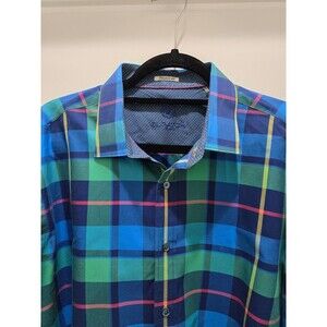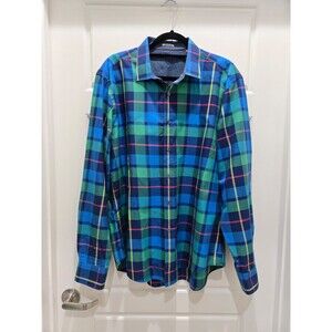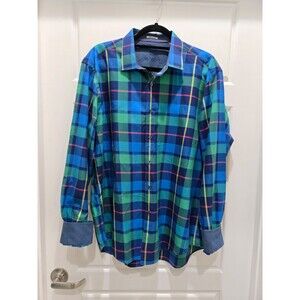 BUGATCHI SHAPED FIT BUTTON UP DRESS SHIRT GREEN BLUE PLAID FLIP CUFFS MEN XL