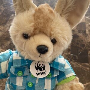 Beautiful coyote BUILD A BEAR in perfect condition,has long Jean plaid shirt and peace shirt inside,accept offers.