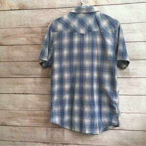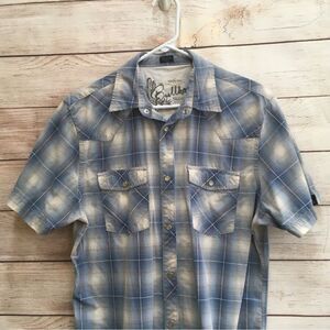 EXCELLENT CONDITION BULLHEAD WESTERN SHIRT IN BLUE PLAID WITH PEARL SNAPS