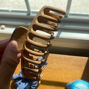 Claw clip, smaller clip, and pony tail with ribbon!