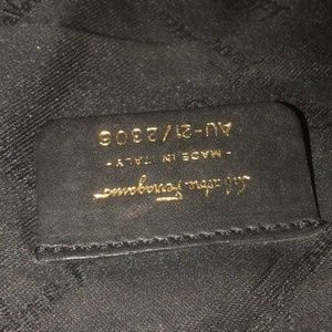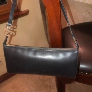 Salvatore Ferragamo Black Leather Pochette Shoulder Bag. Comes with dust bag. AU-21-2306 10"L x 1.2"W x 5"H This is an elegant Salvatore Ferragamo Black Soft Leather Pochette Shoulder Bag. Its exterior features a feminine thin leather shoulder strap adorned with a golden tone ic