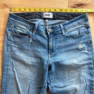 Bundle of 2 Paige ankle and cropped jeans: Skyline Ankle Peg & Verdugo Crop. Both are size 30. All measurements are approximate & taken lying flat. Some measurements can also be found in photos. Verdugo Crop has small flaw - see details below. Bought these for me but they were too tight. Wore lighter pair once or twice. Wore darker pair once.