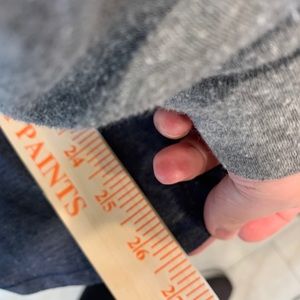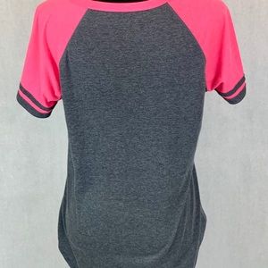 Tee #2- GUC Pink and Gray Reebok Tee. Size large. Small discolored spot near bottom (untreated). Measurements same as blue tee.