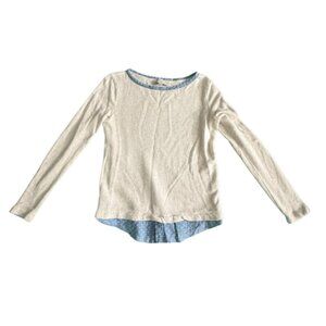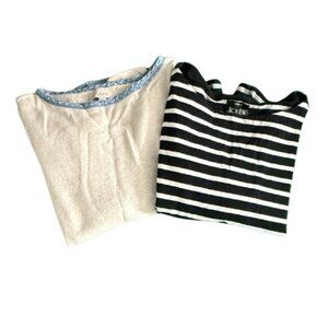 BUNDLE: 2-Women’s Long Sleeve Tops (J.CREW + ANN TAYLOR LOFT), Size S, Gently Worn (BB1503B) includes: 1-Gently Worn J.CREW black and white striped cropped long sleeve top, size S, 100% cotton, crewneck style, approximate measurements: length 17.5", pit to pit 20.5", sleeves 21"; 1-Gently Worn ANN TAYLOR LOFT layered long sleeve top, size S, 100% cotton, off-white body with denim floral collar and attached underlayered denim floral shirt detail, giving the appearance of a layered button-up look, approximate measurements: length 26", pit to pit 21", sleeves 24.5". A stylish and versatile bundle combining a casual cropped stripe top with a chic layered blouse—perfect for work, weekend, or transitional wear. This is a consignment bag item.