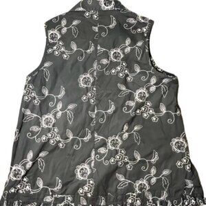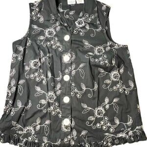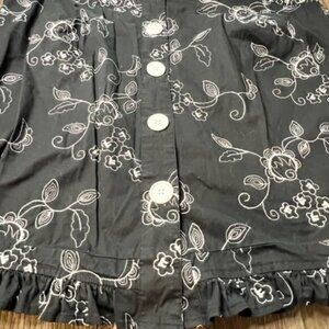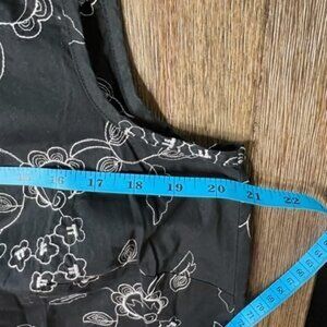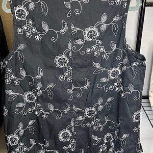 Black with White floral embroidery.  Large White buttons. Sleeveless. Stretch