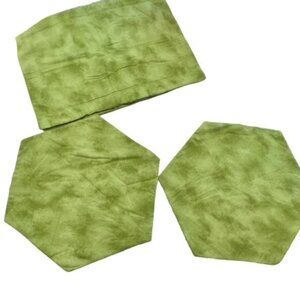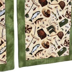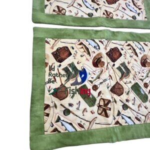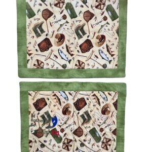Front has fishing theme pattern, back has light green solid color. One of the rectangle placemats has 'I'd Rather be Fishing' embroidered on it.