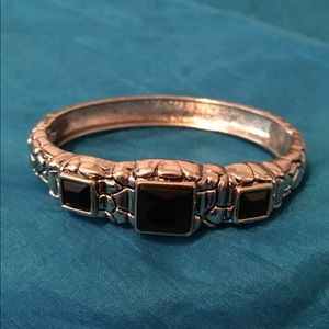 Silver tone bracelet with 3 black squares. Opens easily for most wrist sizes. Rarely worn.