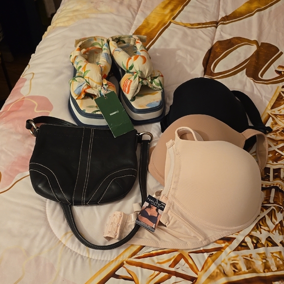 NAUTICA 3 Everyday Bras 40DD . Black leather shoulder bag , FARMRIO Sandals size 8 . / all new with tag except for the purse and it's unbranded.