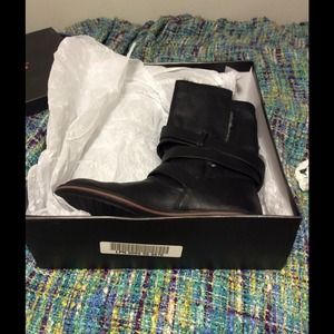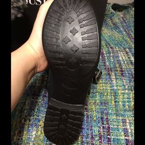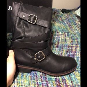 These boots were purchased on Justfab and have never been worn. They are a women's size 10 and hit at the mid calf. They have a buckle detail on the outside which is fully functional. On the inside they are lined with a faux fur. The top can be worn up or rolled down for an effortless rocker chic look. They are brand new and come in the box with all of the original packing materials.