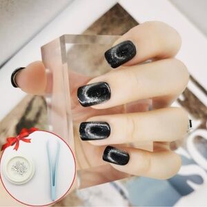 RUNE&SUKYCES cat eye press on nails black short round scented fake nail french tip square glitter uñas postizas for women acrylic gel fall small false nails kit no glue for small nail beds 30pcs