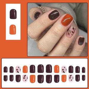 24 Pcs Fall Press on Nails Short Square,ZWENJIE Dark Brown & Orange Fake Nails Press ons Nail Kit Tips with Autumn Leaves Design Full Cover Acrylic Glossy False Nails Glue on Nails for Women Manicure