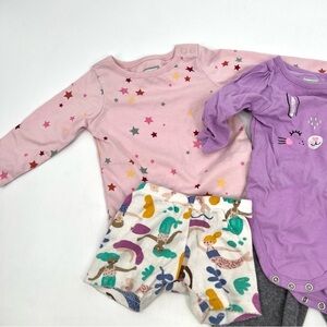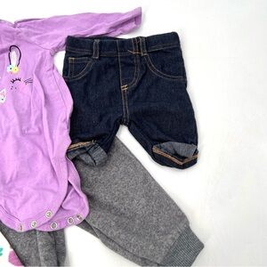 Items are in good used condition. Great for casualwear or loungewear, and also great for transitioning into the spring. Different brands, and similiar sizes ranging from 6 months to 9 months. Please see photographs for visual details. 2 onesies, and 3 bottoms--all come together.