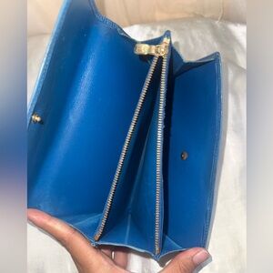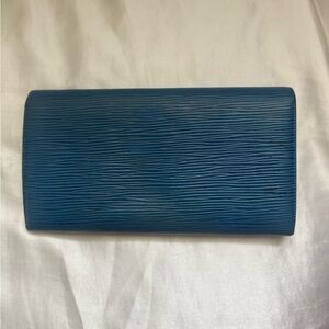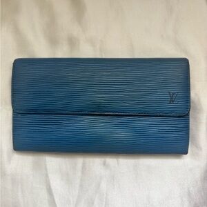 All are authentic Louis Vuitton. All are in good used condition. Chic teal blue leather set by Louis Vuitton. Features a wallet, cardholder, and keychain pouch. Ideal for stylish organization!