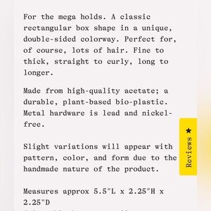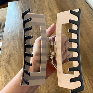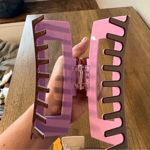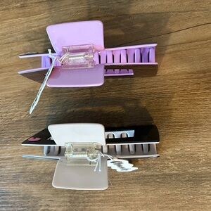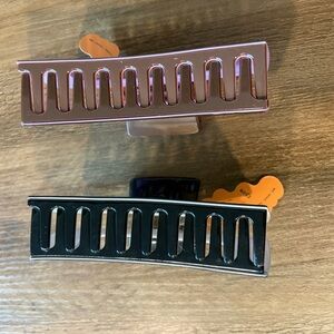 Price is for both clips. Item description included with pics. New with tags, never used. No flaws. You will get this style of hair claw in brown and lilac, as well as black and taupe. See pics for details.