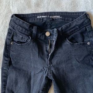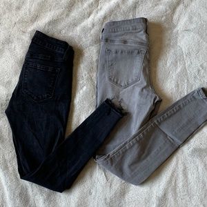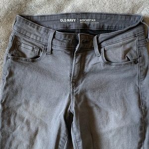 This listing is for two pairs of Old Navy Rockstar jeans. One pair is grey and the other pair is a dusty black with rips in the knees and frayed edges on the bottom. They are still in good condition.