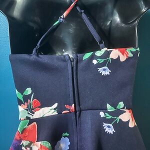 Elegant navy dress with vibrant floral patterns. Perfect for any occasion.