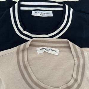 THESE TOPS ARE EACH MADE OF 100% COTTON, MADE IN ITALY THEY EACH HAVE A DOUBLE ACCENT COLOR BAND ON A ROUND NECKLINE, THE CREAM IS WITH A DARKER CREAM COLOR BANDS AND THE DARK NAVY BLUE IS WITH WHITE BANDINGS. THEY LOOK TERRIFIC UNDER A BLAZER OR JACKET.