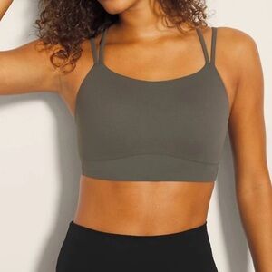 The sports bra “SPORT LONGLINE YOGA BRA in DARK GRAY OLIVE” is a size Large and the bandeau is a size XL