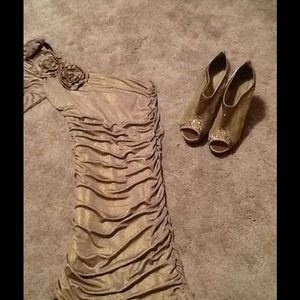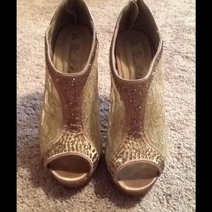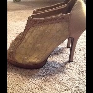 BEAUTIFUL champgne peep toe shoes with lace sides and gold accents in front. Go perfect with dreses for evning wear or jeans a cute blazer for a night out. Never been worn. Size 8. Will bundle with champagne dres for discount. Smoke free house.