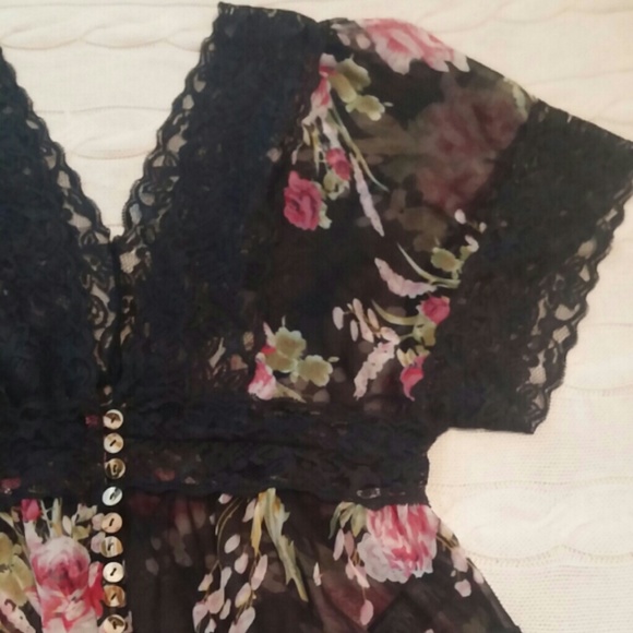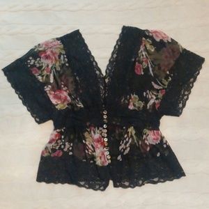 Sheer flower print, lace, and mother-of-pearl shell buttons make this kimono top super femme. Never worn!