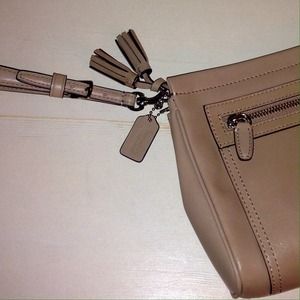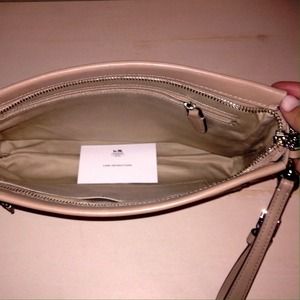 Coach large clutch tan beige wristlet handbag bag used once perfect condition! Not a scratch on it! Made of supple tan leather & silver hardware!