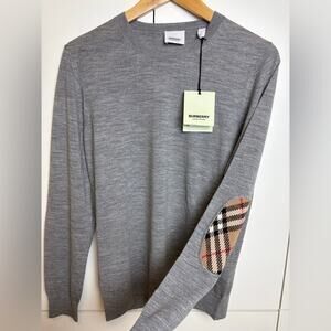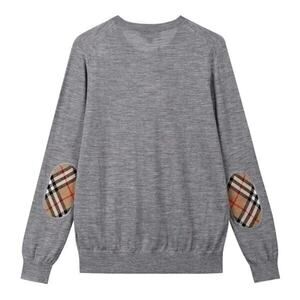 Stylish gray sweater featuring iconic Burberry plaid elbow patches. Perfect for a chic look.