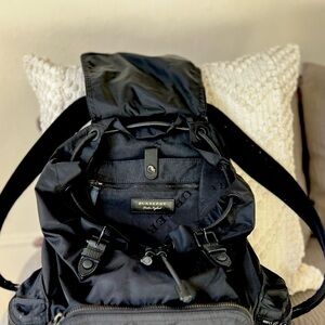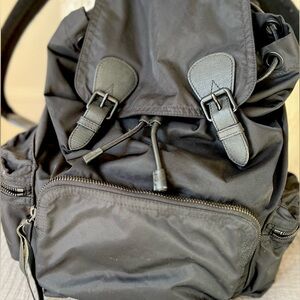 Burberry backpack. Very very gently used, no holes or stains. Black nylon with leather accents and black hardware. Perfect zippers. Approximately 17”x13”x7”